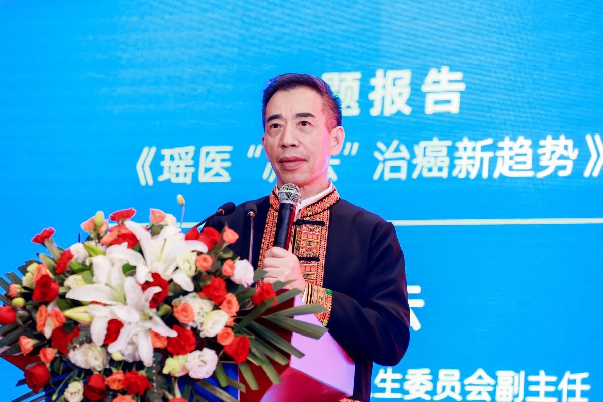 民建中央人口医药卫生委员会副主任、国际防癌长寿联盟主席、中国民族卫生协会副会长、覃氏瑶医第十三代掌门人、北京瑶医医院院长覃迅云教授致辞
