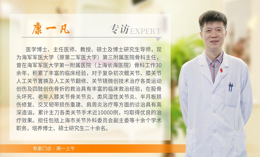 康一凡,医学博士、主任医师、教授、硕士及博士研究生导师,现为上海海军军医大学(原第二军医大学)第三附属医院骨科主任,曾在海军军医大学第一附属医院(上海长海医院)骨科工作30余年,积累了丰富的临床经验,对于复杂初次髋关节、膝关节人工关节置换及人工关节翻修、关节镜微创技术治疗各类运动创伤及四肢创伤骨折的救治具有丰富的临床救治经验,在股骨头坏死、老年人膝关节骨关节炎、类风湿性关节炎、半月板损伤修复、交叉韧带损伤重建、肩周炎治疗等方面的诊治具有高深造诣。累计主刀各类关节手术近10000例,均取得优良的治疗效果。担任包括上海市关节外科委员会副主委等十余个学术职务,培养博士、硕士研究生二十余名。
