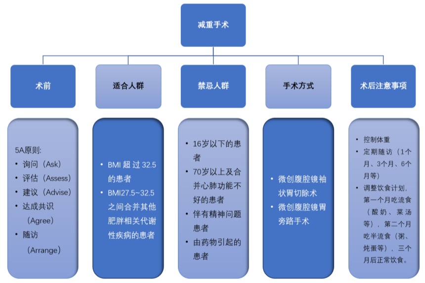 · 术前:采取5A原则,即询问(Ask)——评估(Assess)——建议(Advise)——达成共识(Agree)——随访(Arrange)。通过5A原则,来详细制定患者的减重手术计划。