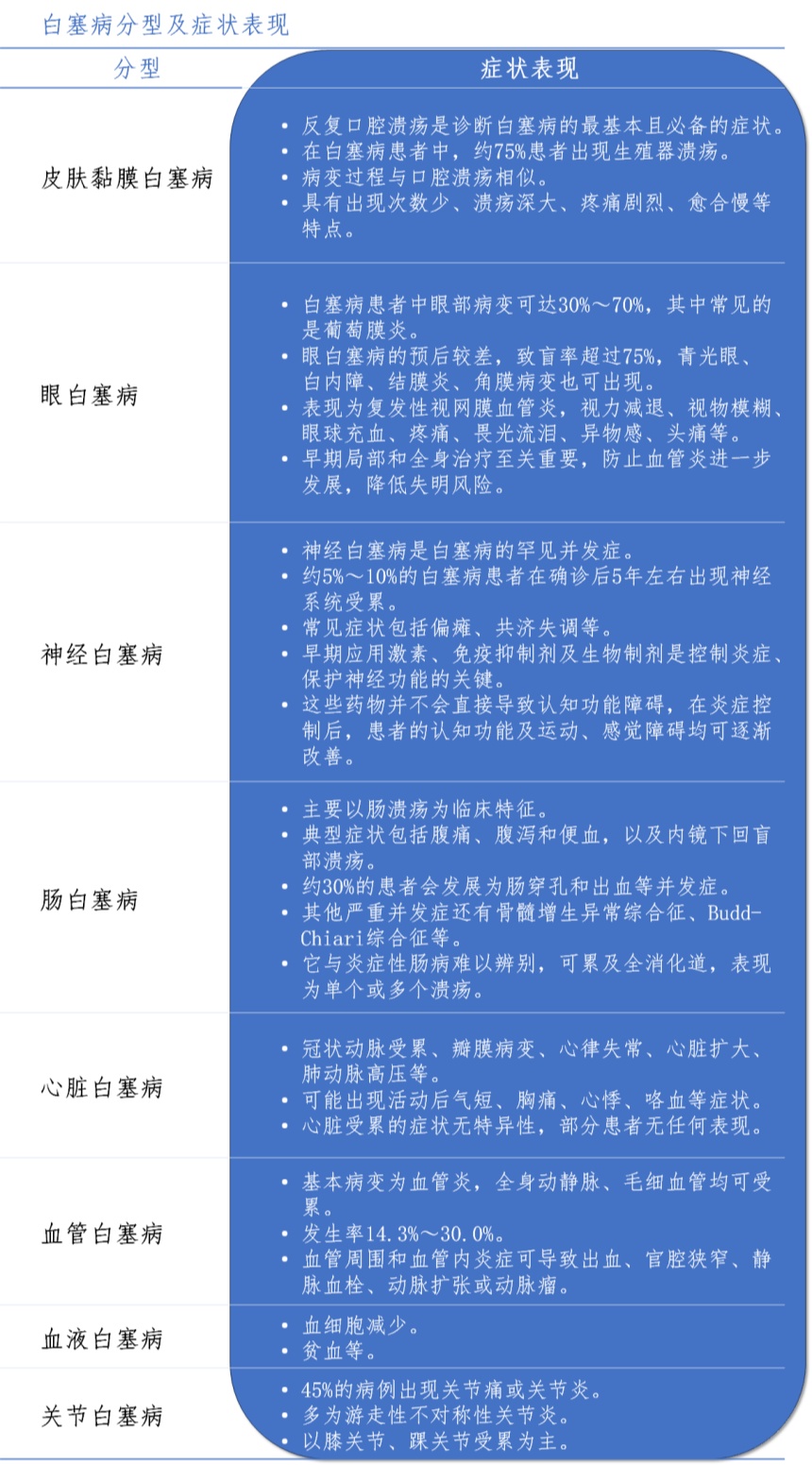 复旦大学附属华东医院风湿免疫科团队率先提出将白塞病分为8种类型:皮肤黏膜型、眼白塞病、神经白塞病、肠白塞病、心脏白塞病、血管白塞病、血液白塞病和关节白塞病。其中,皮肤黏膜型是最基本的表型,而神经白塞病、血管白塞病和关节白塞病在少数情况下可与其他表型重叠。