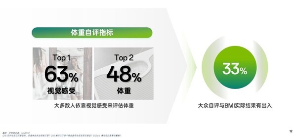 大众对体重标准尚未完全了解。在评估体重时,大众多采用视觉感受相关的指标,部分人群采用健康指标进行评估。但总体来看,大众仍缺乏对科学监测工具的了解和应用,导致33%的受访者的自我判断与实际情况有一定偏差。