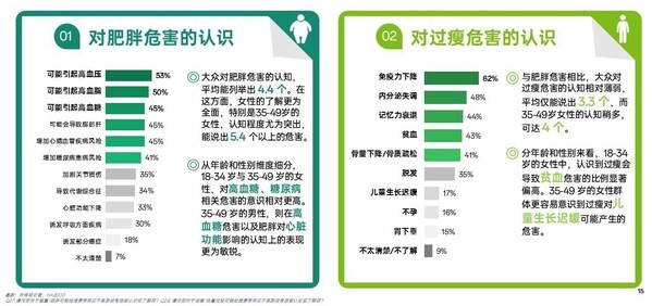 大众对不健康体重带来的危害和长期影响缺乏整体认知,体重管理意识有待进一步加强。大众能认识到肥胖可能引起高血压、高血脂和血糖,平均能列举出4.4个危害。尤其是中年女性,认知程度尤为突出。与肥胖危害相比,大众对过瘦危害的认知相对薄弱,平均仅能说出3.3个。