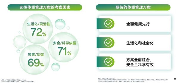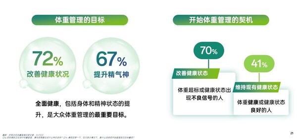 调查数据显示,50%受访者自评目前面临超重或肥胖风险,73%受访者有体重管理的意识、希望改善体重,64%受访者愿意为体重管理付出努力,投入时间和精力。