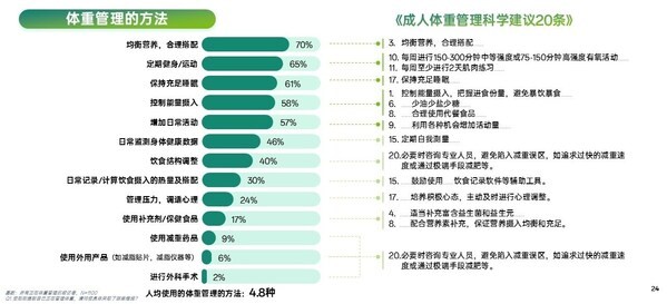 大众正积极探索多样体重管理方法,初步落实部分《健康体重,美好生活——成人体重管理科学建议20 条》建议,但执行时的完整性、规范性和差异性尚有待加强。大众人均尝试4.8种体重管理方法,但尚未做到"因人而异"。普遍积极践行营养均衡、定期运动和控制能量,但在日常监测和饮食调整方面行动相对较少。少数人选择快速减重手段,如药物和手术,需更多专业指导,避免药物滥用。