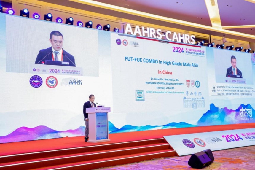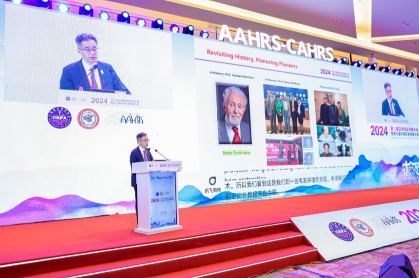 吴文育教授在大会主会场发表主旨报告,题为《Future Development of Hair Transplant in China》,吴教授回顾了中国植发的发展史,CAHRS的创立及历届会议的回顾,毛发移植术式的演变,国内毛发移植器械领域的最新产品以及国产化植发机器人系统等先进设备,指出毛发移植已从单纯手术逐渐发展为融合药物及非药物治疗、头皮抗衰的头皮健康综合治疗模式,并对未来的毛发移植市场进行展望。