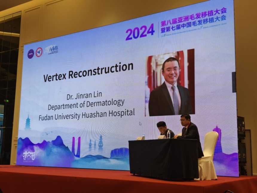 林尽染教授在英文会场进行了名为《FUT-FUE COMBO in High Grade Male AGA in China》的口头报告,总结了重度脱发患者枕部受累,单FUE无法满足需求时,联合FUT可以提高单次手术获取的毛囊单位数,从而避免过度提取。在植发手术中需要注重患者安全,严格把握适应症,强调药物和其他非手术治疗对植发效果保驾护航的重要作用。