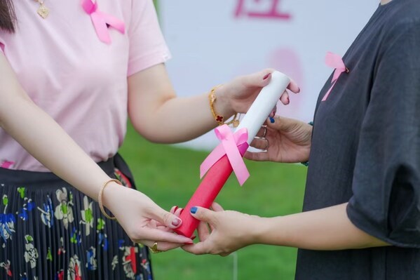 复旦学子代表把象征粉红力量的粉色接力棒传递给社会受助者