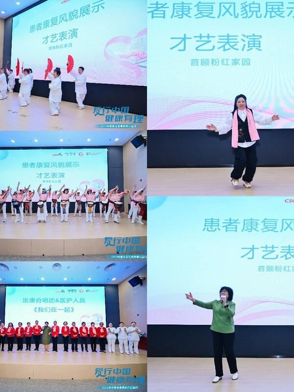 在首颐粉红家园的患者才艺表演中来到了整场活动的高潮部分,她们带来了精心准备的独唱、舞蹈、太极扇、非洲鼓等表演,充分展现了患者不屈不挠、积极自信、乐观向上的风貌。最后首钢医院乳腺疾病科主任王丕琳教授带领医护人员与首颐粉红家园的患者朋友倾情奉献了大合唱《我们在一起》,体现了医护一家亲,共同面对病魔、战胜病魔的决心!活动也圆满落下了帷幕!