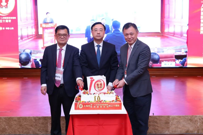 开幕仪式最后,秦净书记、蔡郑东教授以及上海市一医院骨科疾病临床医学研究中心主任周许辉教授,共同为这一盛事切下了寓意着圆满与美好的蛋糕。这不仅是对过去十年努力的肯定,更是对未来充满信心和期待的象征,预示着新的开始,寄托着美好的祝愿。