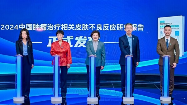 《2024中国肿瘤治疗相关皮肤不良反应研究报告》发布仪式(自左至右):欧莱雅皮肤科学美容事业部孟颖琪女士、北京大学公共卫生学院刘民教授、北京爱谱癌症患者关爱基金会史安利理事长、中日友好医院崔勇教授、欧莱雅皮肤科学美容事业部郑一诫博士。