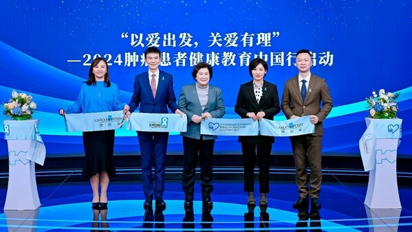 “以爱出发,关爱有理”——2024肿瘤患者健康教育中国行活动启动仪式(自左至右):欧莱雅皮肤科学美容事业部沈重女士、复旦大学附属肿瘤医院秦文星教授、北京爱谱癌症患者关爱基金会史安利理事长、北京大学首钢医院莫雪莉教授、欧莱雅皮肤科学美容事业部郑一诫博士