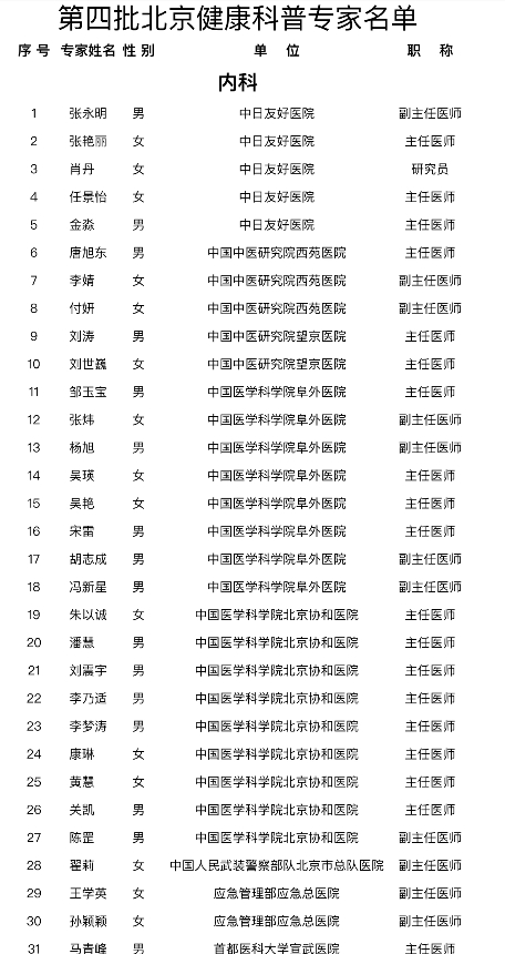 北京市为进一步充实市级健康科普专家资源,更好地满足广大市民多元化健康需求,持续提升首都市民健康素养水平,2024年1月,开展了第四批健康科普专家库建设,经过单位推荐、市级审核、遴选评审,第四批北京健康科普专家库正式组建,同时发布《北京健康科普专家管理办法(2023修订版)》。目前,专家名单已通过北京市卫生健康委官网正式公布。