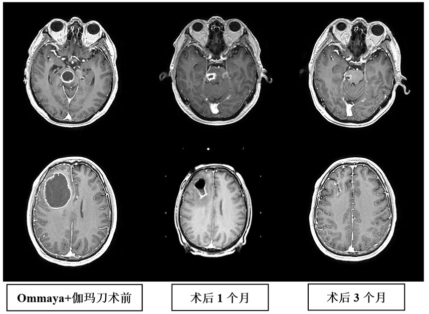 1、伽玛刀联合Ommaya囊穿刺引流术治疗巨大囊性脑转移瘤。穿刺引流可迅速改善占位效应,减少神经功能损害,结合伽玛刀治疗,提高病灶的局控率,当囊性病灶位于脑干等重要功能部位时,治疗效果更加明显。2018年12月,我们在上海脑转移瘤高峰论坛分享了此项经验。