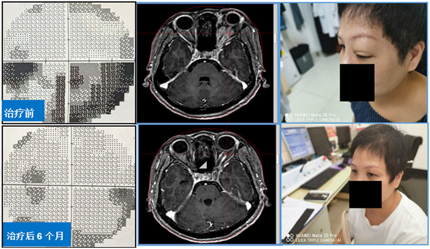 3、伽玛刀治疗眶内球后占位,保全视力视野、改善突眼症状。球后占位患者常伴有突眼、视力下降及视野缺损,伽玛刀分割治疗可快速缓解突眼症状,减轻视神经压迫,再逐步“吃掉”残余肿瘤。该方法是眶内球后占位最有效的治疗手段之一。