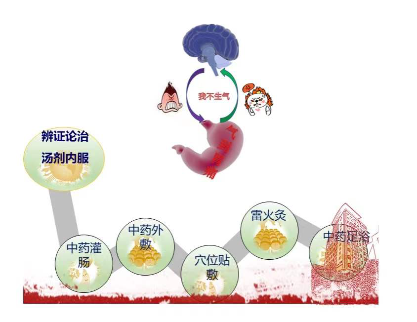 中西医结合治疗消化心身疾病发挥了两者的优势,西医在解决消化道局部问题方面有优势,而中医则在发挥全身调节方面有特色,两者互为补充,相得益彰。上海中医药大学附属上海市中西医结合医院脾胃病科治疗该类疾病具有以下特色:① 消化专科用西药联合调畅情志中药;② 抗焦虑/抗抑郁药联合消化专科用中药;③ 消化专科用药联合抗焦虑、抗抑郁药和中药;④心理治疗或情志疗法联合西药和/或中药。除了言语疏导之外,科室还采用针灸治疗,缓解患者紧张、焦虑的情绪,改善腹胀、腹痛、失眠等症状;推拿、拔罐、敷贴、耳穴等辅助,以达到“心、身”,“形、神”四位一体,同步治疗。