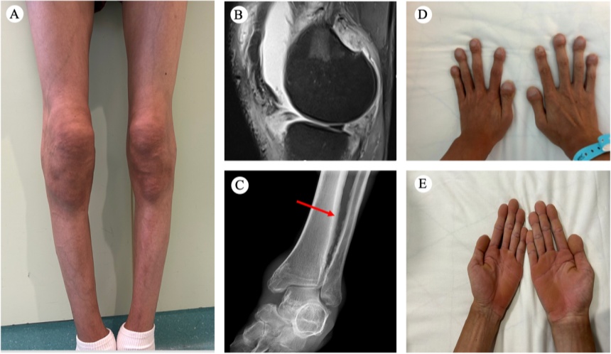 图1:(A)膝关节肿胀及肿大 (B)磁共振成像显示滑膜增生 (C)胫腓骨X线显示骨膜增生(红色箭头所示) (D)杵状指 (E)掌跖角化